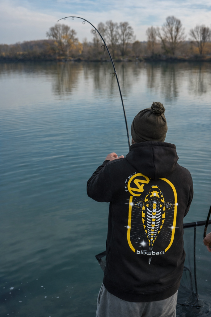 Op de rug domineert een karper in topaanzicht en geplaatst tegen een diepteraster, met coördinaten die verwijzen naar een legendarisch water waar menig visser zijn droomvis achterna ging.